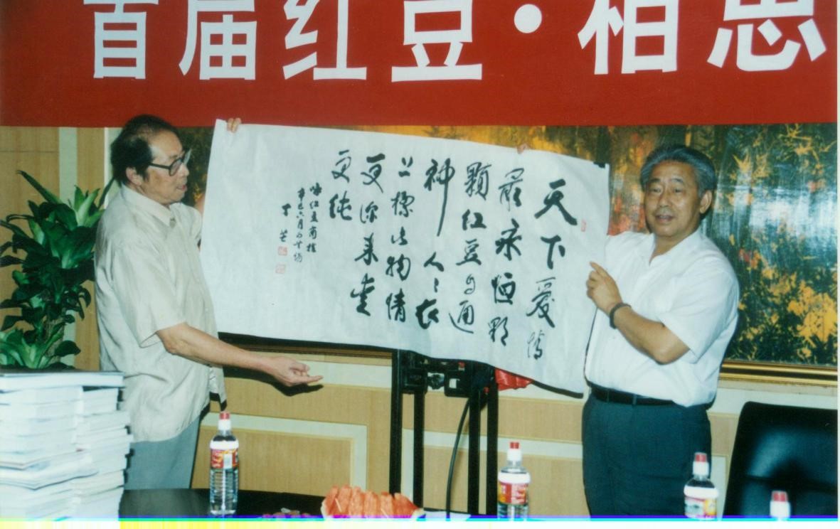 正如丁芒老先生所說:我與紅豆有緣!2002年,丁芒再次來到了紅豆集團(tuán),這次也是因為“七夕節(jié)”。第二屆紅豆七夕節(jié)活動的主題是詩詞,而詩詞又是丁芒老先生最擅長的領(lǐng)域,所以紅豆集團(tuán)再次邀請丁芒前來助陣。當(dāng)時,紅豆集團(tuán)與中華詩詞學(xué)會、中華詩詞雜志社、無錫市委宣傳部聯(lián)合舉辦了紅豆詩詞大賽,開先河的設(shè)立一等獎20萬元人民幣,累計獎金40萬元“尋當(dāng)代王維”,在中國詩壇轟動一時。丁芒老先生被邀請作為大賽的初評和終評評委,著名作家、南京市作家協(xié)會顧問馮亦同老先生也是當(dāng)時的評委之一。據(jù)悉,當(dāng)天的新聞發(fā)布會就引來了《人民日報》、《光明日報》等100多家新聞媒體,同時也邀請到了賀敬之、柯巖等10多位文壇名家。