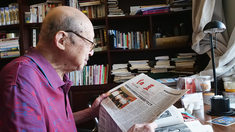 7月29日,今年的七夕前夕,當(dāng)代著名老詩人、作家、文藝評論家丁芒在家中認(rèn)真錄制著對紅豆七夕節(jié)20周年的祝福視頻。中國當(dāng)代詩壇曾有“北臧南丁”之說。丁芒,這位從南通城走出來的大詩人,從抗日戰(zhàn)爭的烽火開始生命的吟唱,80載筆墨為伴,書寫了萬余首激蕩人心的詩篇。面對記者的拜訪,丁芒和其夫人都十分熱情?,F(xiàn)已96歲高齡的他,看起來依舊面色紅潤,精神飽滿。在丁芒老先生家中,能夠感受到濃濃的文化氣息,書柜上、書桌上擺滿了各種書籍。雖然已是耄耋之年,丁芒老先生依然每天以書籍為精神食糧,在他的身上,我們看到了一個詩人對詩詞的忠貞和熱愛,對傳統(tǒng)文化的敬畏和崇拜。
